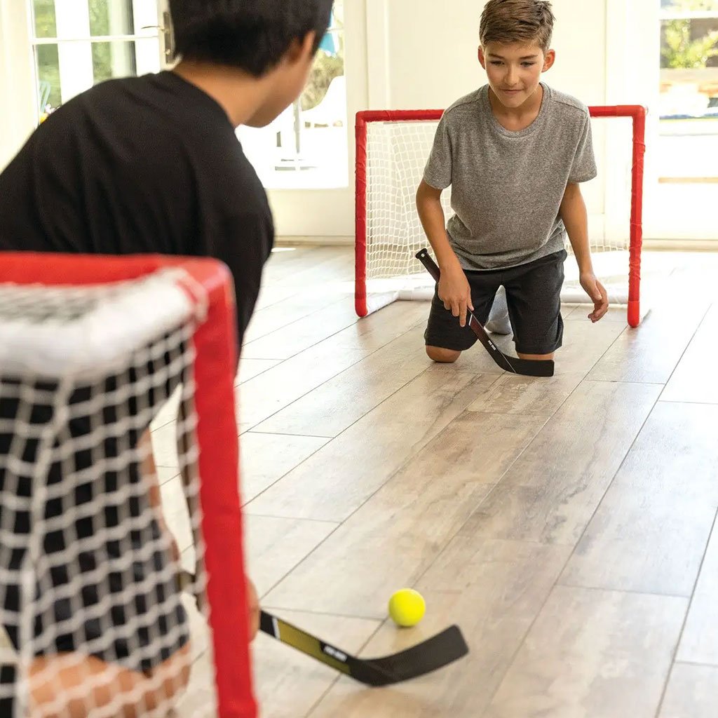 Lass den Spaß fließen. Das Pro Mini Hockey Set sorgt für Spaß und Spannung drinnen und draußen. Dieses komplette Spielset bietet stundenlange 1-gegen-1-Hockey-Action mit Spielen, Shootouts und Trickshot-Herausforderungen. Perfekt, um im Winter im Wohnzimmer Energie zu verbrennen oder eine actionreiche Sommernacht im Garten zu verbringen. Jedes Set enthält 2 robuste Tore, 2 Minischläger und 1 Schaumstoffball. Mit seinen einfach zu montierenden PVC-Toren und den robusten Minischlägern ist das Pro Mini Hockey Set langlebig, schnell verstaut und immer einsatzbereit. Packen Sie das Set überall aus und genießen Sie stundenlangen Spaß mit Freunden.